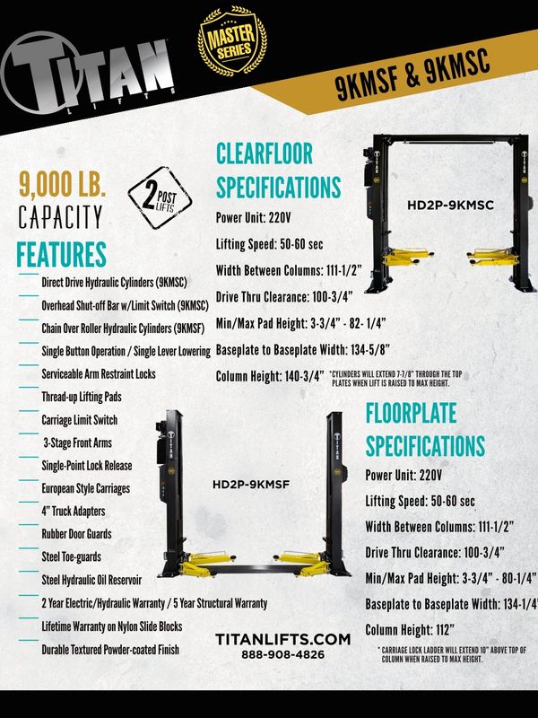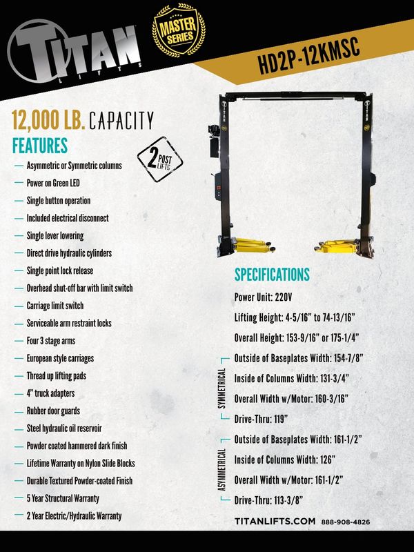 The all-new Titan Lifts Master Series 12,000lb two post clear floor lift—perfect for any hobbyist or commercialized application. With the flexibility to have asymmetric or symmetric columns and two height options of either 154” or 176” this lift is a great option for most applications. The 12KMSC comes with a premium motor by 100-year old industry innovator Bucher Hydraulics, and a robust set of 3 stage arms to ensure years of consistent operation. Combine all that with the included disconnect and one button operation to be the last lift you will ever need.